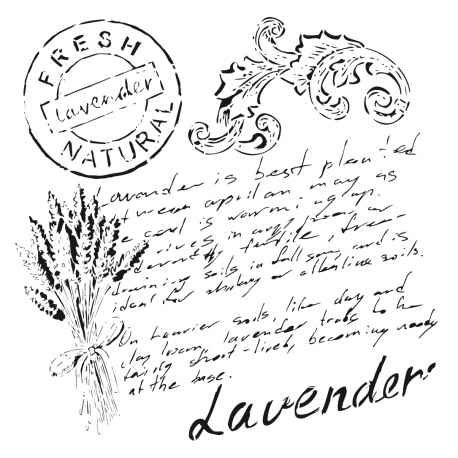 Plantilla con texto manuscrito LAVENDER con sello ramita.